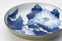 椿は、古代、日本の風土に深く根付いている伝統的な花の一つで今回は、深川製磁の伝統工芸士 「松華」により、椿を染付で細密に描いた作品です。この意匠がフカガワブルーと映えて、大胆に存在感を放ちます。