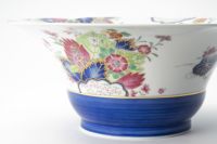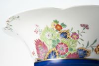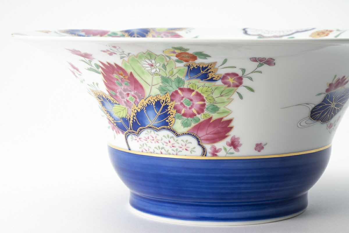 花を模した形状の大鉢は圧倒的な存在感を放ち、牡丹、菊、朝顔、なでしこなどの華やかな草花が、桃色を中心に鮮やかな色彩で描かれています。