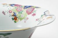 染錦で描かれ桃色の花を印象的にデザインしているこのスタイルは忠次の意匠帳の中にも見い出すことができない。珍しく強い調子の染付を配し若草色・桃色とやや弱めの色彩を使い上絵された意匠は絢爛さの中に品を感じる作品になっています。