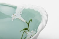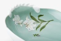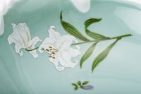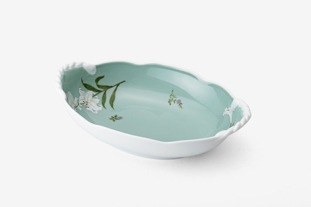 白百合の花言葉は「純潔、無垢」。何よりもこだわったのは、上品な「WHITE」です。上質な陶石を1350度の高温度で焼成する事により生まれる透けるような真白な磁器肌。幸せの大輪を咲かせたような優雅な白百合の花びらは、伝統的な技法によって特別に調合したいくつもの白い上絵具で描かれ、モダンなニュアンスをもつ柔らかな白のハーモニーが魅力です。愛らしいフリルのかたちにのせて優しい風に揺らぐ清楚な白百合の姿はまるでレリーフ。使う度に幸せに包まれるコレクションです。