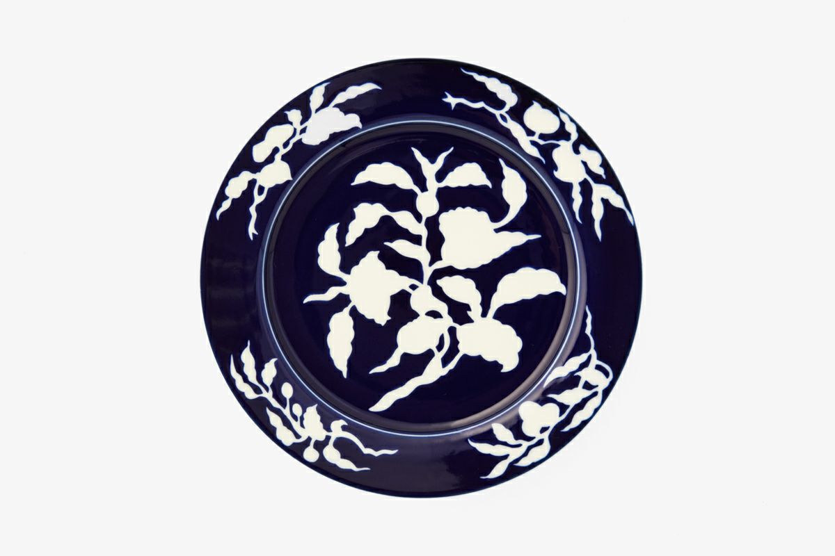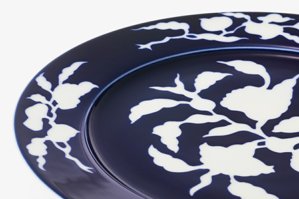 深川製磁の代名詞とも云える瑠璃色のうつわです。他にはない深みのある瑠璃地に、白抜きで花と葉をつけたざくろの折枝を表現致しました。お持ちの様々な色合いのうつわとも相性が良く、日常使いに活躍してくれるうつわになっています。