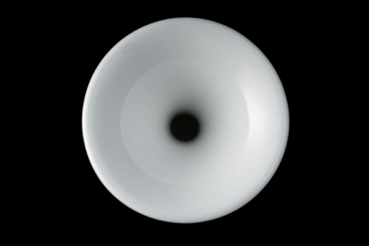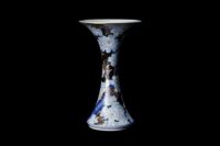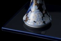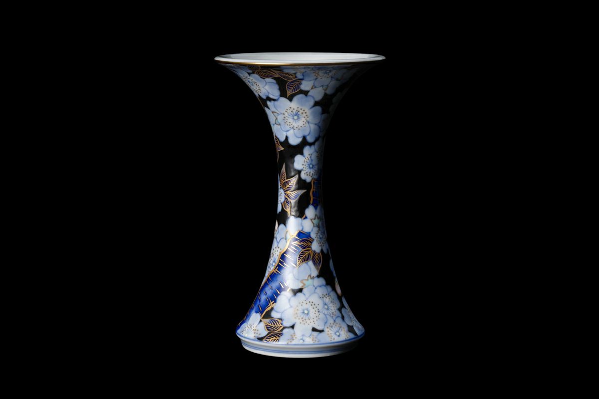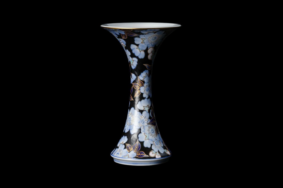 「金襴桜」は、うすく柔らかい桜の花を染付の濃淡で描き、ひとつひとつを金彩にて縁取りし、さらに本来白磁として浮かび上がる磁器肌をくまなく上絵黒で濃み(だみ)込んでいます。熟練の絵付け職人の筆致が、また絵具職人による独自の色彩の重なりが、本作を上品で魅力的な作品へと仕上げています。