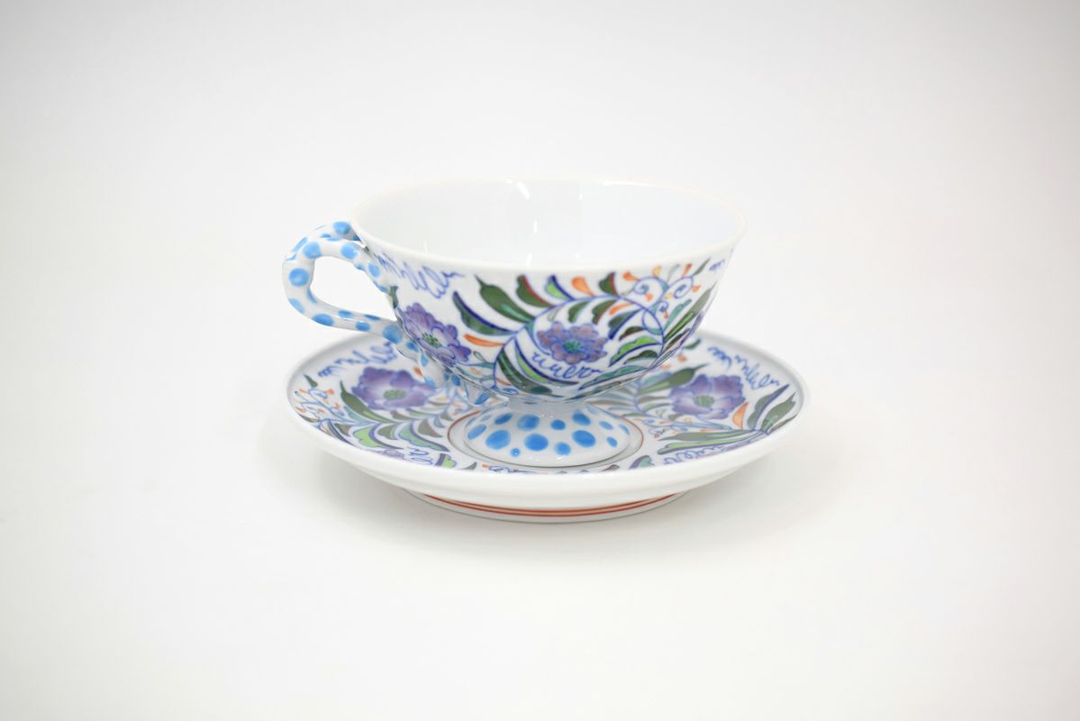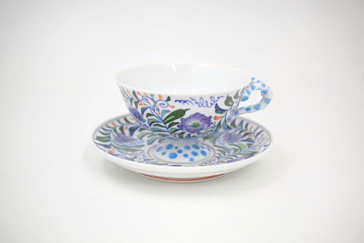 唐草は、ペルシャでは、アラベスク文様と呼ばれ、古今東西の人々に愛されている古典的文様です。本作のペルシャ唐草は、19世紀に生まれた「釉下彩」を施し、1350度で本焼成した後に、さらに赤絵を施した世界でも珍しい染錦技法で彩色した作品となっております。