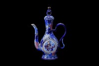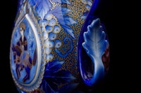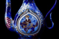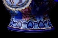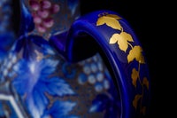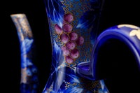 明治27年 創業当時より制作している作品で、中国明代にイスラムの王様のために創られた飾水差がルーツと思われます。 中央の窓絵にはイスラムの騎馬に乗った勇者が描かれ、周りには深川独自の染錦文様「ブドー金ミル」を配しています。複雑な形状に熟練の職人がブドー唐草を染付けし、釉薬をかけて1350度の窯でじっくり焼き上げると魅力的なブルーの水差しが焼き上がります。 さらに、赤絵の工房で、金彩とブドーの紫色を絵付して800度強の錦窯で焼き上げます。 粘土精製から成形、染付、釉薬、焼成、赤絵まで、それぞれの職人の熟練の技と心が生み出す工芸磁器の魅力をお楽しみください。