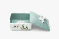 白百合の花言葉は「純潔、無垢」。何よりもこだわったのは、上品な「WHITE」です。上質な陶石を1350度の高温度で焼成する事により生まれる透けるような真白な磁器肌。幸せの大輪を咲かせたような優雅な白百合の花びらは、伝統的な技法によって特別に調合したいくつもの白い上絵具で描かれ、モダンなニュアンスをもつ柔らかな白のハーモニーが魅力です。愛らしいフリルのかたちにのせて優しい風に揺らぐ清楚な白百合の姿はまるでレリーフ。使う度に幸せに包まれるコレクションです。