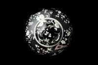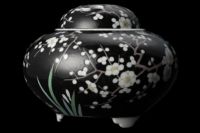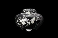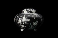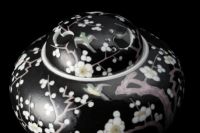 黒の上絵で梅を描いた美しい香炉です。職人の繊細な手仕事が光る逸品です。