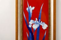 本作は、大胆に美しい菖蒲が真ん中に描かれています。本来であれば陶磁器の「白」と染付の「青」の対象で仕上げられるところをあえて菖蒲絵の外側を赤色の上絵で施しており、この赤によって強調された染付の「青」の陶磁器としてのデザインは、19世紀の欧州で大きな反響を呼びました。それまでの有田焼になかったこの斬新なデザインは、深川スタイルとして百年以上深川製磁の魅力になっています。