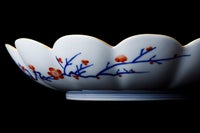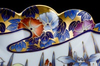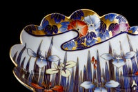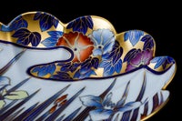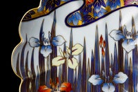 明治27年に有田に工房を設立した深川忠次は明治33年(1900年) パリ万国博覧会に出展し名誉金牌を受賞します。 その後、欧州各地を視察し代理店を設けて直輸出を始めます。 日本の工芸品は世紀末のヨーロッパでジャポニズム人気を起こし、アールヌーボに影響を与えました。 本作品は、当時の輸出意匠そのままに復刻したもので、あやめと朝顔を伝統の「染錦手法」で描き、その構図は当時も今も斬新でモダンなものです。パリの貴婦人の人気の的となった日本の工芸磁器は、今もその魅力で世界の愛好家を魅了し続けています。