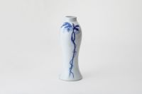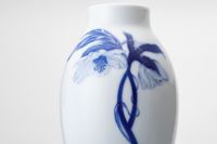 うつむき加減のクリスマスローズの花、清楚な女性のやさしさをイメージし、花言葉は「私を忘れないで・・いつもあなたのそばにいるから・・・」 微妙に違う青の上絵具をいくつも重ねて深みのある上絵のブルーを純白の磁肌に絵付けして、深川独自の技法でクリスマスローズの魅力を表現したものです。 アールヌーボ全盛の時代に流行った魅力的な形姿は、お花がきれいに納まり、洋間でも和室にもマッチするデザインとなっております。