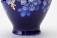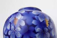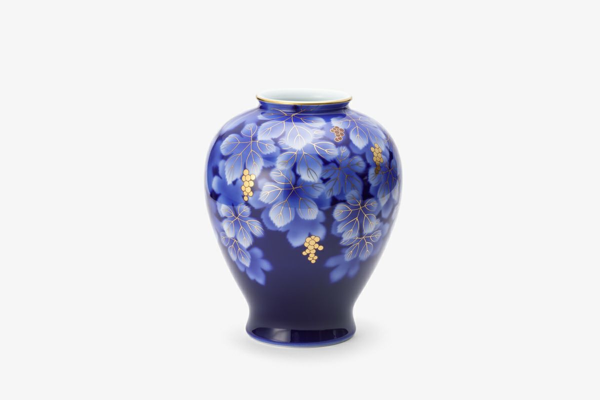 初代深川忠次は、1900年パリ万博出展後に欧州各地を巡り、西欧の新たな技法を吸収し帰国します。 圧搾空気を使用したエアログラフは、染付けの吹き掛け手法として自ら学び、機械を導入します。 本作品は、当時より好んで描いたブドー絵を、深川独自の吹き掛け手法で染付けたものです。 蔓を延ばして成長するブドーの生命力を表現し、豊穣・繁栄の吉祥文様として現代も愛され続けております。