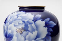 瑠璃地に淡い牡丹を描いた花瓶です。他にはない凛とした美しさがあります。裏面は瑠璃一色の為、シチュエーションによって使い分けてお使い頂けます。花瓶の前面に描いた淡い大輪の牡丹と、瑠璃地とのコントラストが美しいです。葉の葉脈、口縁にアクセントとして金彩をいれています。