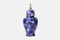 初代深川忠次は、1900年パリ万博出展後に欧州各地を巡り、西欧の新たな技法を吸収し帰国します。 圧搾空気を使用したエアログラフは、染付けの吹き掛け手法として自ら学び、機械を導入します。 本作品は、当時より好んで描いたブドー絵を、深川独自の吹き掛け手法で染付けたものです。 蔓を延ばして成長するブドーの生命力を表現し、豊穣・繁栄の吉祥文様として現代も愛され続けています。