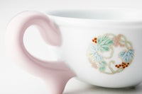 内側に描かれているのは、明治時代から続く、花をリースの様に丸紋にした意匠です。四季の草花を身近で愛でる装束や工芸品に用いようとするのは、まさに日本人の美意識『雅』とも云えます。可愛らしいかたちはお子様から大人まで幅広くご愛用頂けます。