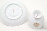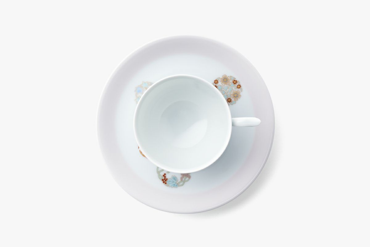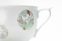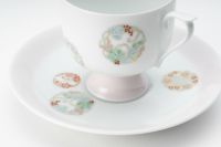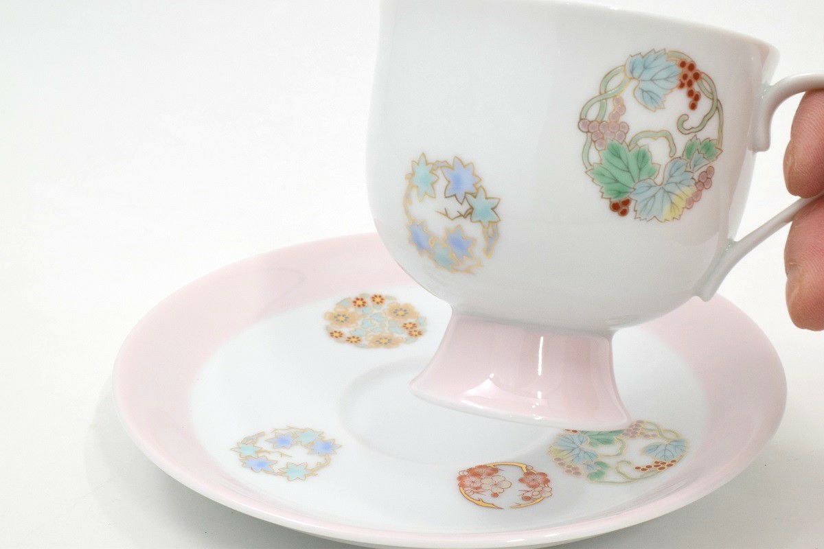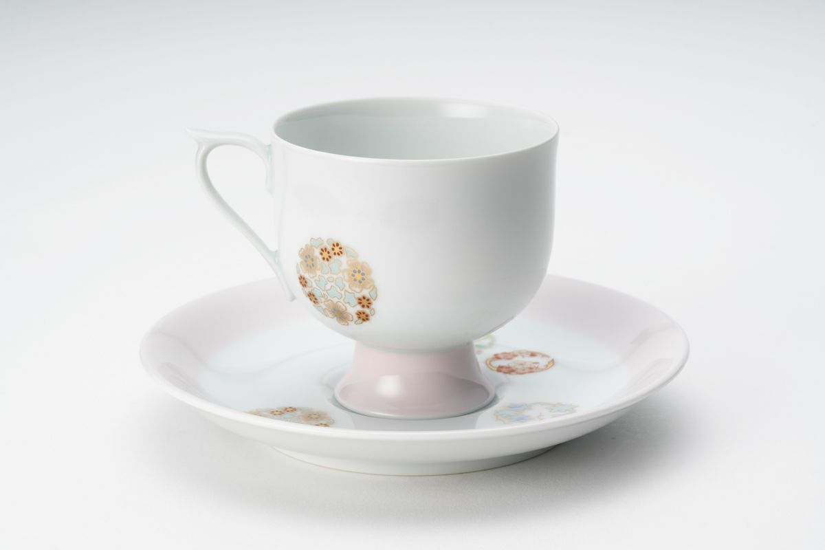 明治時代から続く、花をリースの様に丸紋にした意匠です。四季の草花を身近で愛でる装束や工芸品に用いようとするのは、まさに日本人の美意識『雅』とも云えます。ソーサーにもカップの高台にも優しいピンク色が施されているため、可愛らしいと上品さを感じさせます。