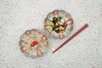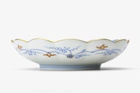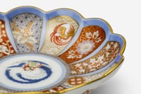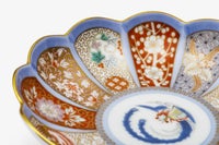 菊割の輪花鉢は、柿右衛門様式として広く知られています。19世紀末新しい有田の意匠として1900年パリ万国博覧会に出展した深川忠次は、彼のオリジナルデザインをパッチワークのようにこの輪花鉢の花弁に施しました。
