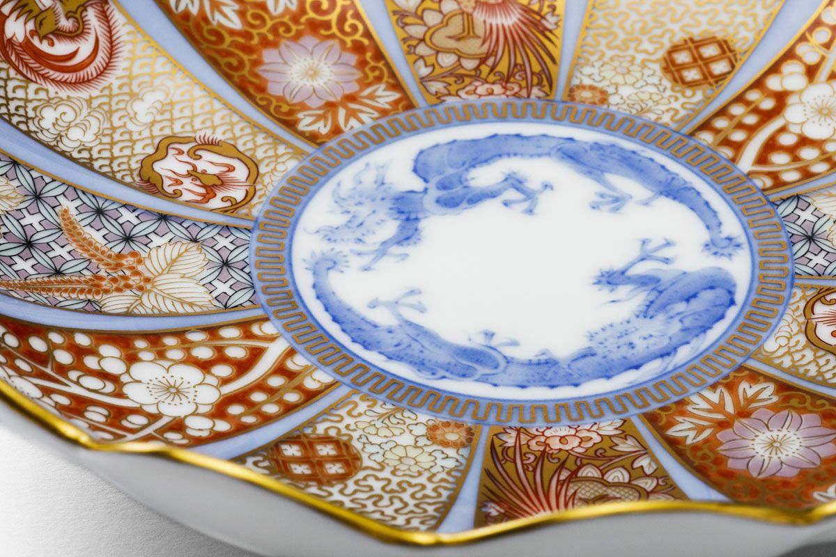 中央には鳳凰を描き、周りには鳳凰唐草、桐、梅外赤、丸紋金ミル、竜鳳凰丸紋、牡丹外赤など吉祥文様を窓絵で配しています。初代深川忠次が明治末から大正期にかけて欧州へ輸出した作品を致復刻しました。
