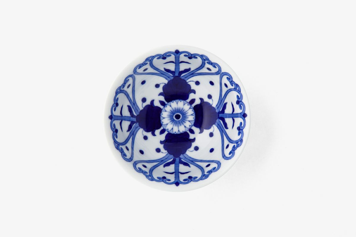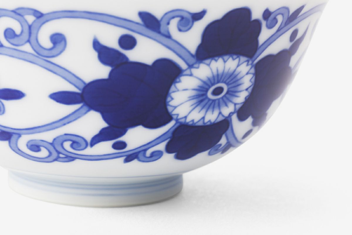 生地に顔料が吸収されやすいことから、淡い色で描くのは難しいとされる染付技法を用いた菊花と唐草の意匠。精緻な線描きや濃み(だみ)による筆跡を残した塗りなど、染付の魅力を感じていただける器です。