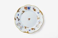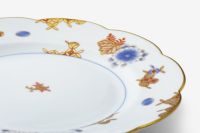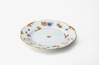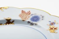 この絵柄は、御用食器の意匠の中で代表的な菊に七宝(金・銀・瑠璃・玻璃(がらす)・しゃこ・サンゴ・瑪瑙(めのう))をデザイン化したものです。七宝の円形は円満を表し、繋げば繋ぐほど無限に広がるところから吉祥であるとされ、その由来の通り『不老長寿』、『子孫繁栄』を象徴します。