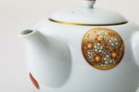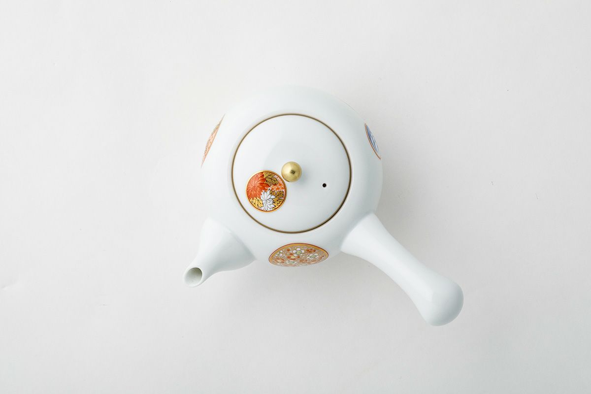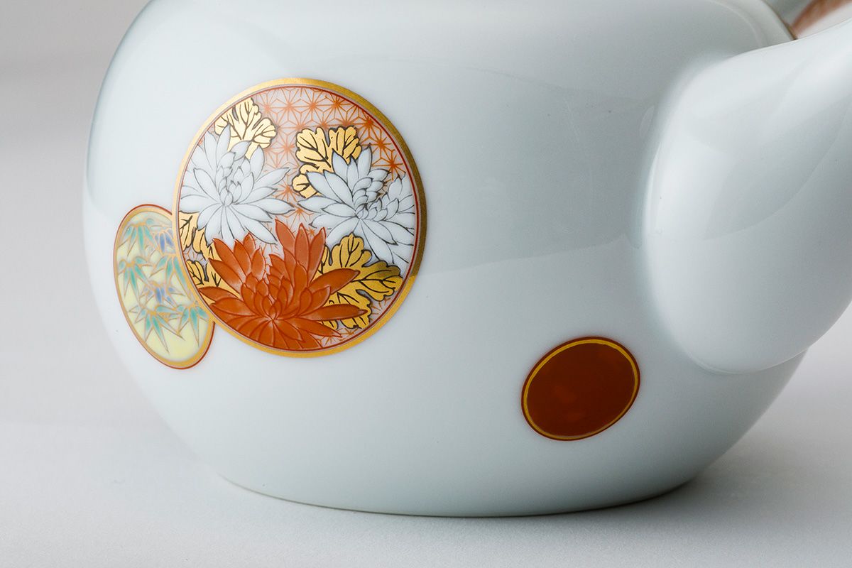 白き磁肌に遊ぶ丸紋は、西洋のドット模様を連想させモダンな印象を与えます。また、丸紋に丹念に描かれた五つの絵は古来からの吉祥文様である四君子「蘭・竹・菊・梅」とその永続を意図した「西海波」を赤絵付けしたものです。その華麗な色合いは食卓に彩りを添えてくれます。