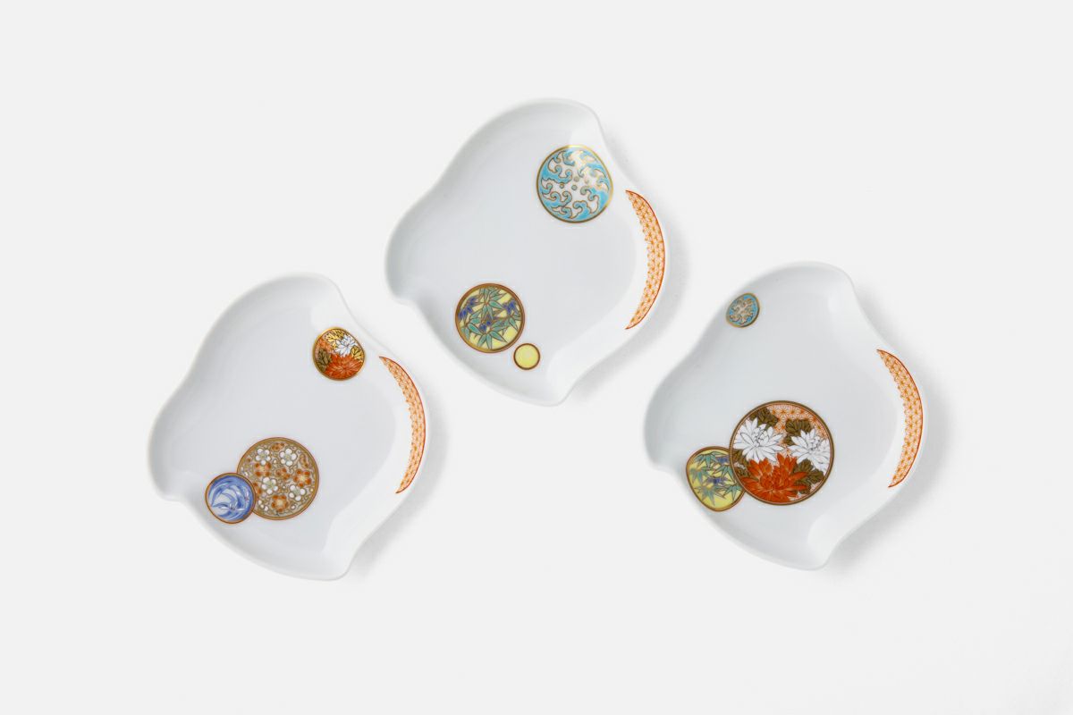 白き磁肌に遊ぶ丸紋は、西洋のドット模様を連想させモダンな印象を与えます。また、丸紋に丹念に描かれた五つの絵は古来からの吉祥文様である四君子「蘭・竹・菊・梅」とその永続を意図した「西海波」を赤絵付けしたものです。その華麗な色合いは食卓に彩りを添えてくれます。