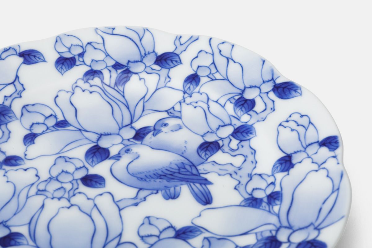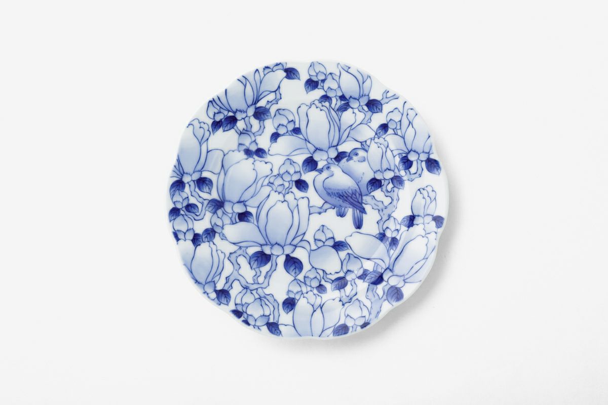 初代 深川忠次が、明治期より好んで用いたモチーフの花鳥絵であります。染付の繊細なタッチで木蓮と小鳥を美しく描いています。