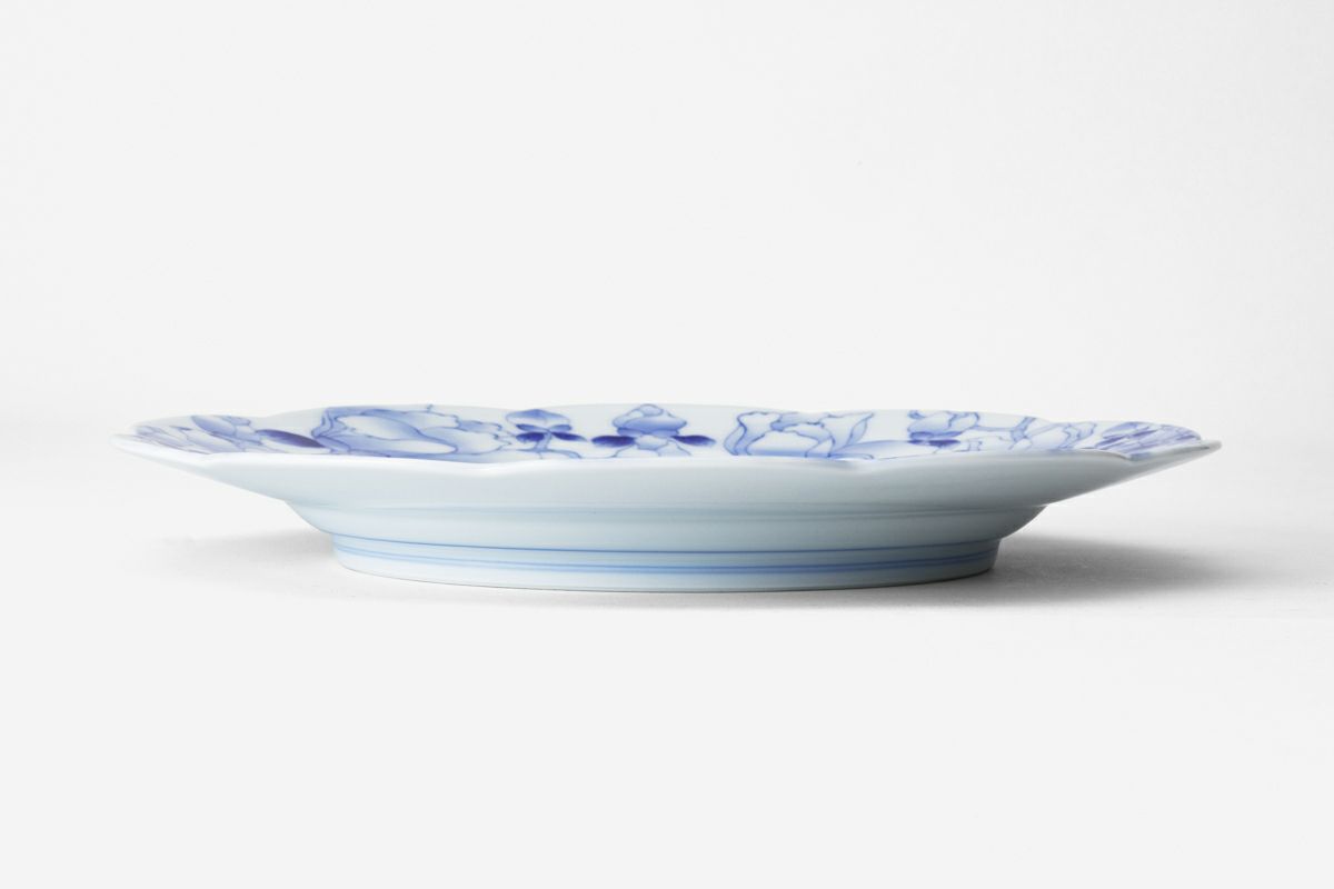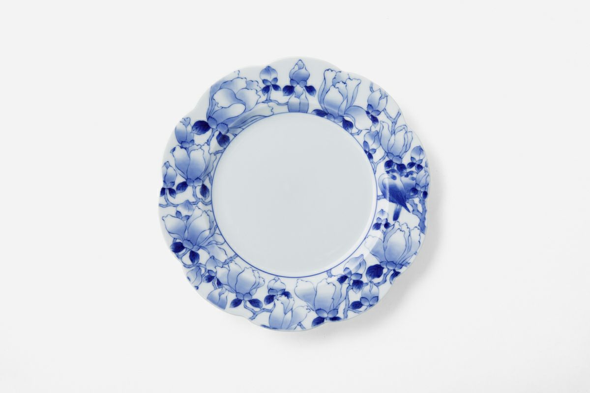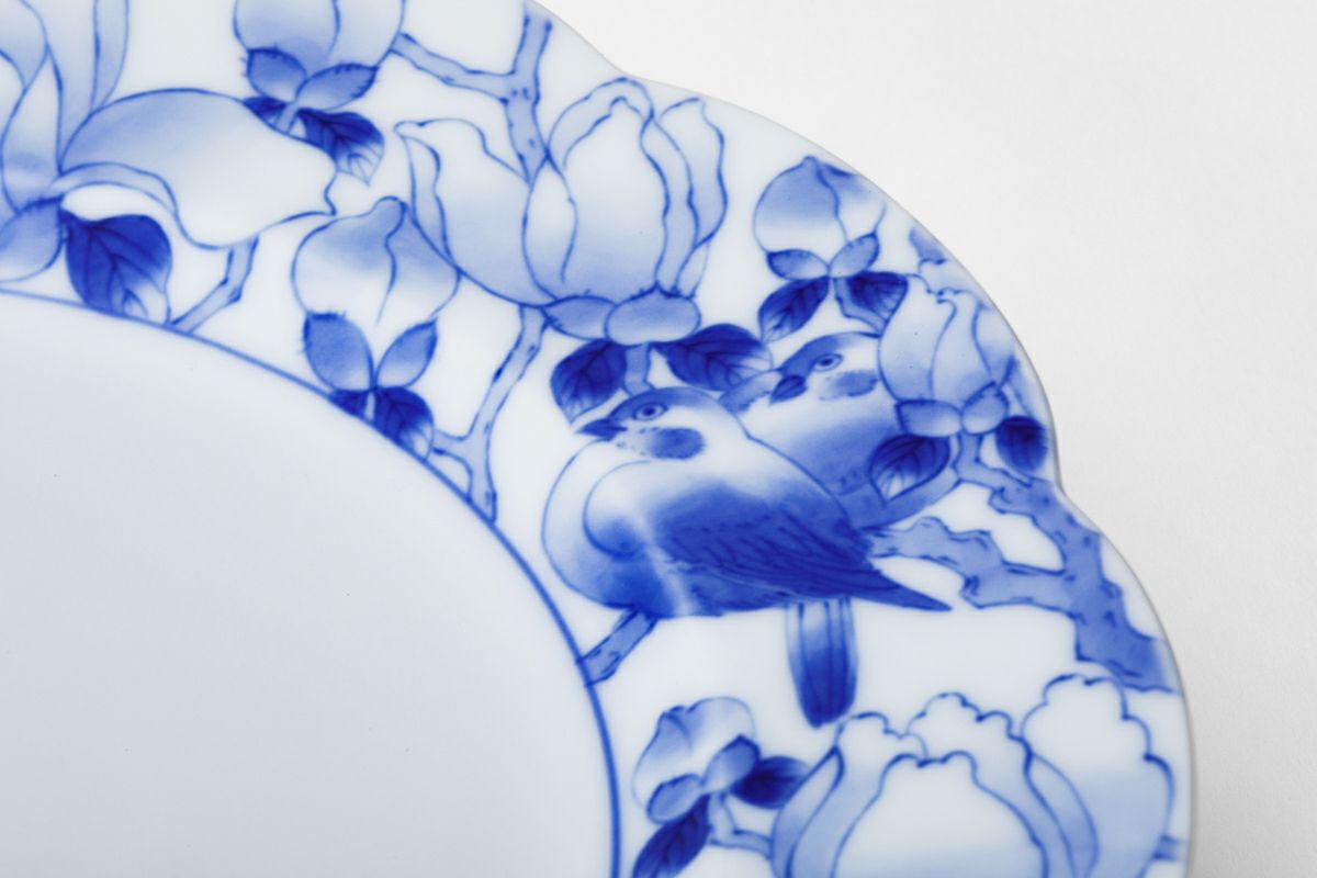 初代 深川忠次が、明治期より好んで用いたモチーフの花鳥絵であります。染付の繊細なタッチで木蓮と小鳥を美しく描いています。