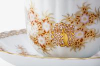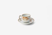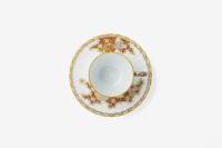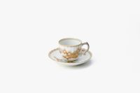 花の中にうずくまる兎をモチーフに上絵で仕上げた鍋島花兎シリーズのコーヒー碗皿。