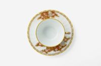 花の中にうずくまる兎をモチーフに上絵で仕上げた鍋島花兎シリーズの紅茶碗皿。