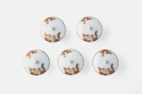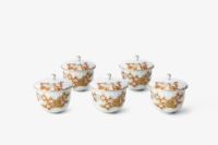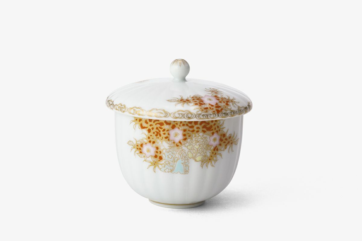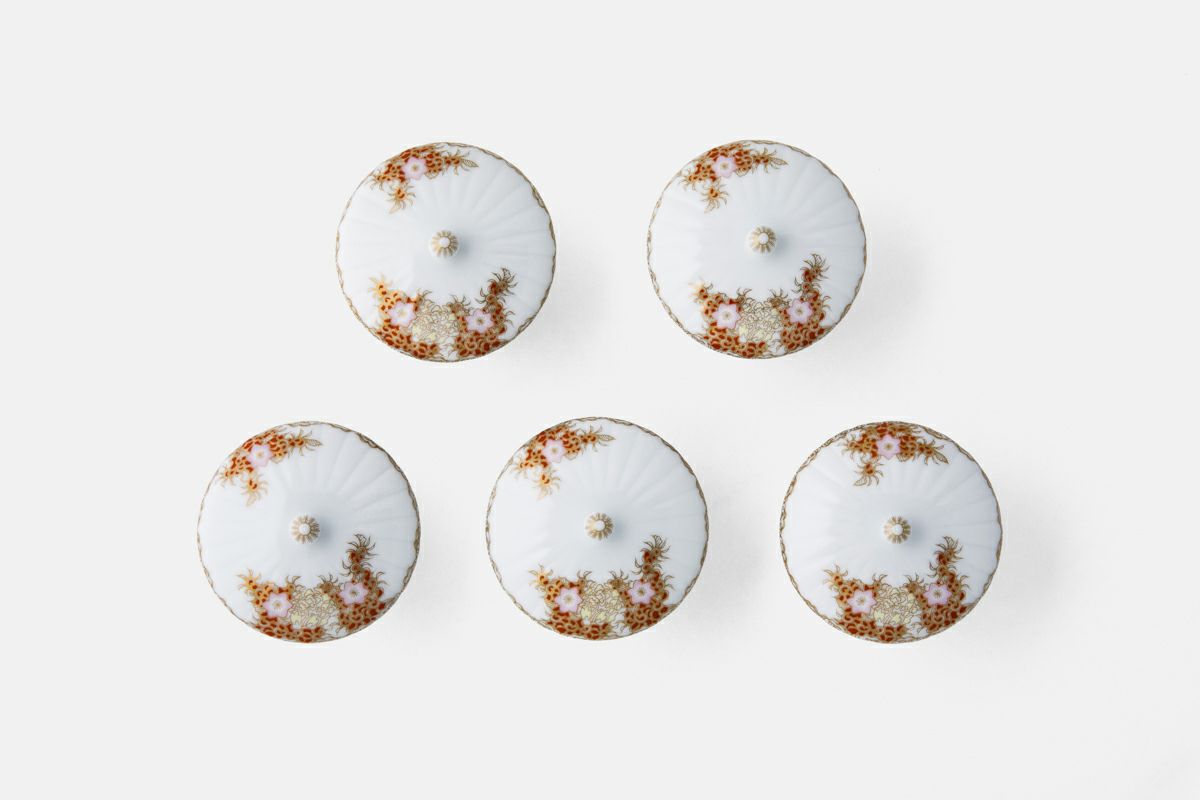 花の中にうずくまる兎をモチーフに上絵で仕上げた鍋島花兎シリーズの蓋付煎茶碗5客揃です。
