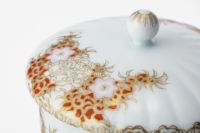 有田焼として江戸期、最高の藩用仕上げを誇った色鍋島。 この「花兎図柄」は、鍋島直映公から初代深川忠次に寄与された明治期最高の深川様式の一つに数えられています。 木灰釉によるやわらかな磁肌は、繊細な絵付とともに明治調の気品を醸しだしている作品と云えます。