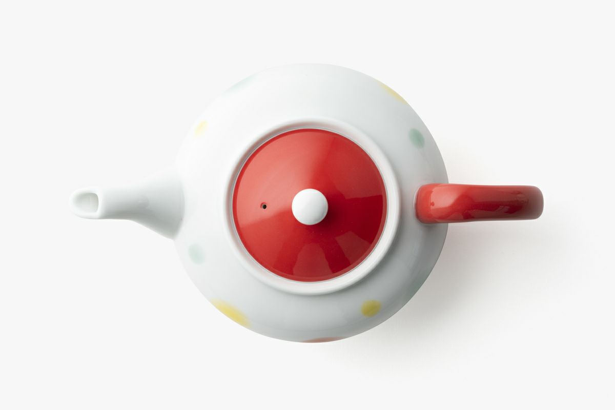 蓋と持ち手に優しい赤を配色することで、ふんわり踊るやわらぎ水玉とのバランスが相性よく、彩ります。ポットの持ち手の曲線は握りがよく、安心感があります。水玉模様が食卓に彩りと和らぎを与えてくれます。