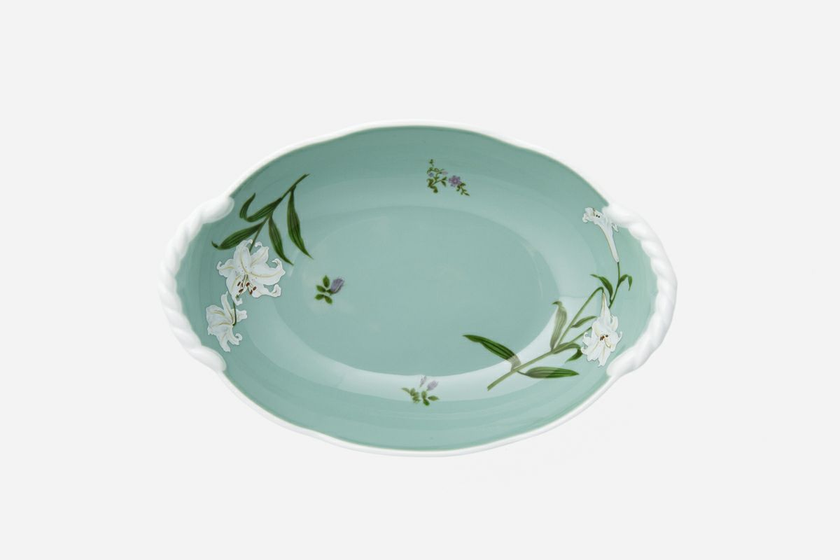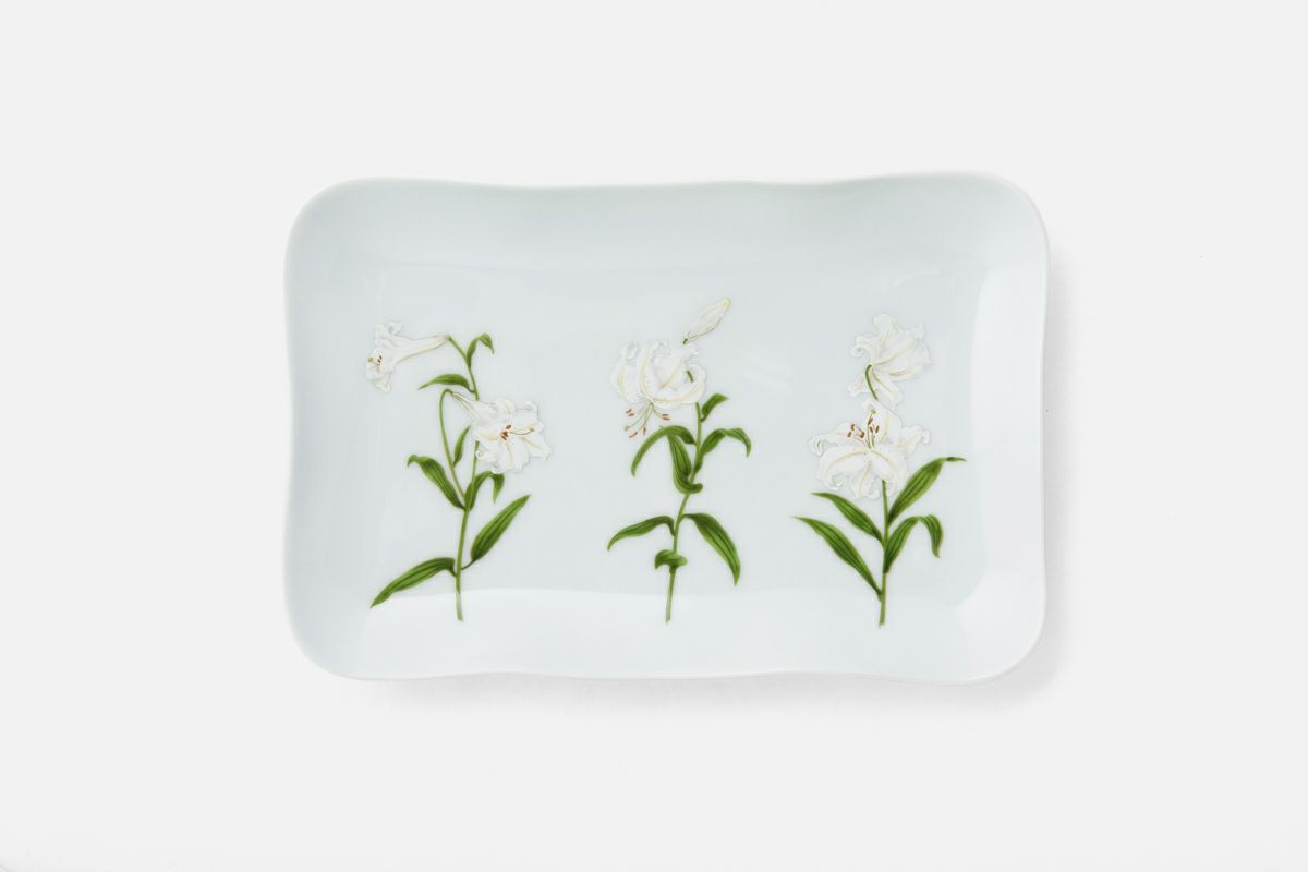 幸せの大輪を咲かせた優雅な白百合の花弁は、伝統的な技法によって特別に調合したニュアンスの異なる幾つもの白い上絵の具で表現され、