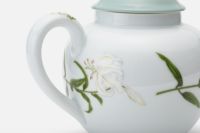 白百合の花言葉は「純潔、無垢」。何よりもこだわったのは、上品な「WHITE」です。上質な陶石を1350度の高温度で焼成する事により生まれる透けるような真白な磁器肌。幸せの大輪を咲かせたような優雅な白百合の花びらは、伝統的な技法によって特別に調合したいくつもの白い上絵具で描かれ、モダンなニュアンスをもつ柔らかな白のハーモニーが魅力です。愛らしいフリルのかたちにのせて優しい風に揺らぐ清楚な白百合の姿はまるでレリーフ。使う度に幸せに包まれるコレクションです。