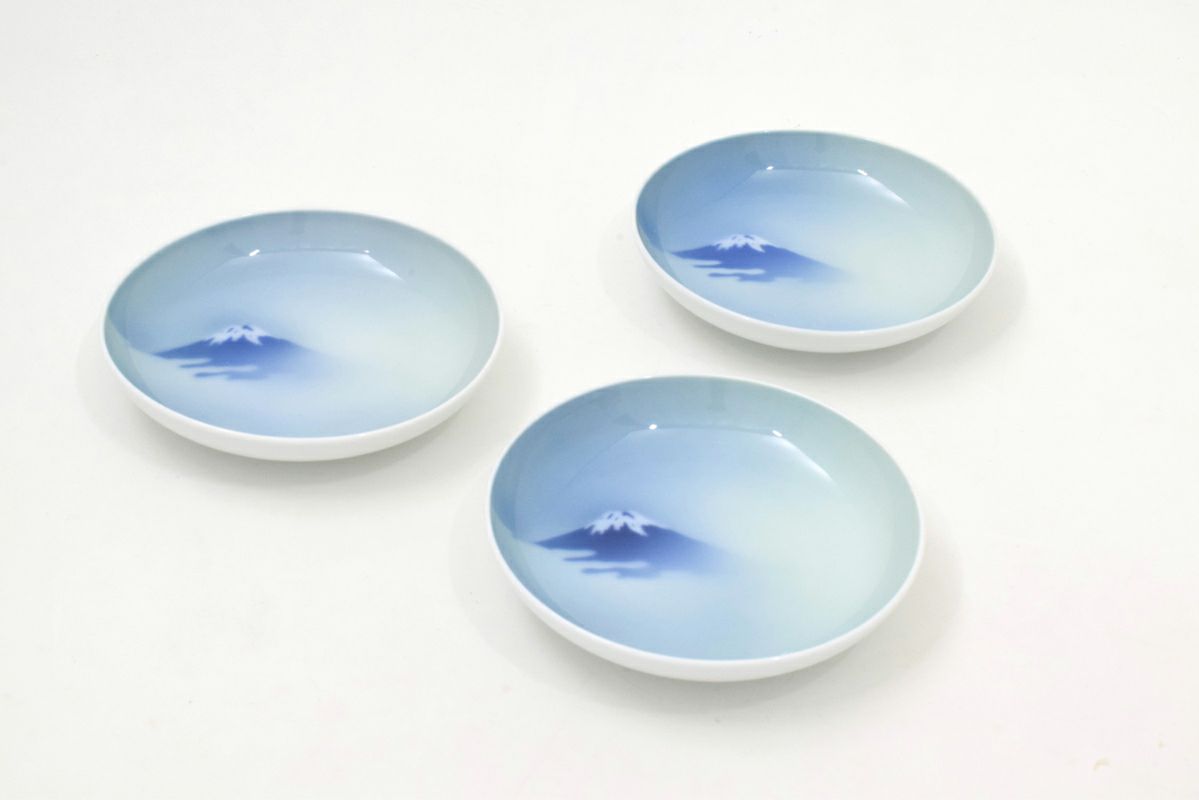 代表的な富士の意匠を登り窯で焚かれた作品。柔らかなエアログラフと優しい青磁の表情をお楽しみいただけます。