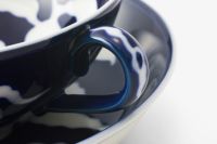 深川製磁の代名詞とも云える瑠璃色のうつわです。他にはない深みのある瑠璃地に、白抜きで花と葉をつけたざくろの折枝を表現致しました。お持ちの様々な色合いのうつわとも相性が良く、日常使いに活躍してくれるうつわになっています。