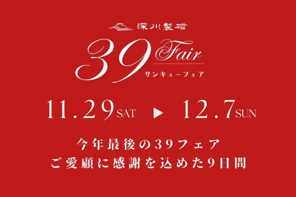 深川製磁では11月29日(土)〜12月7日(日)までの9日間、日頃のご愛顧に感謝を込めて39(thank you)Fairを開催いたします。